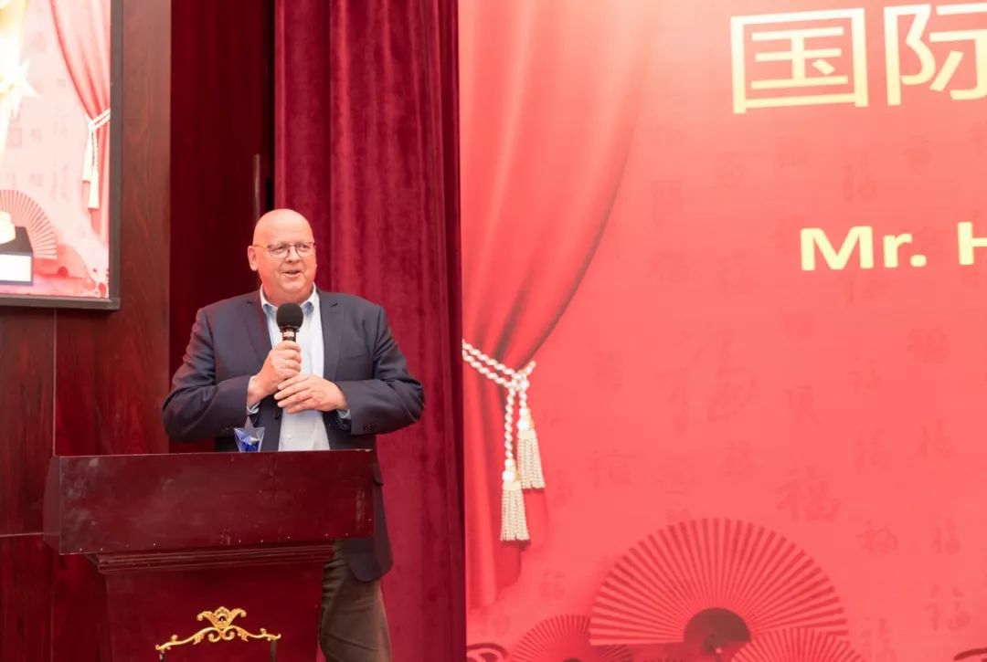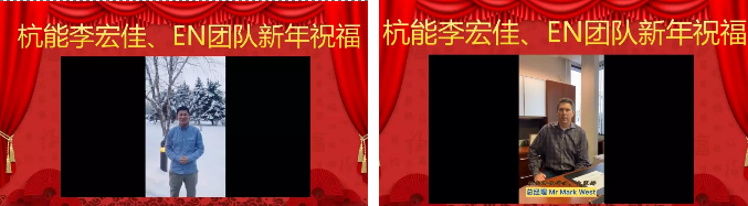 期間,杭能國際合作伙伴Eisenmann公司的各位領(lǐng)導(dǎo),以及杭能的駐美代表李宏佳發(fā)來新春寄語視頻??偣窘K維爾利董事長李月中,歐洲維爾利總經(jīng)理Hubert Wienands也上臺表達(dá)對杭能的新年祝福。