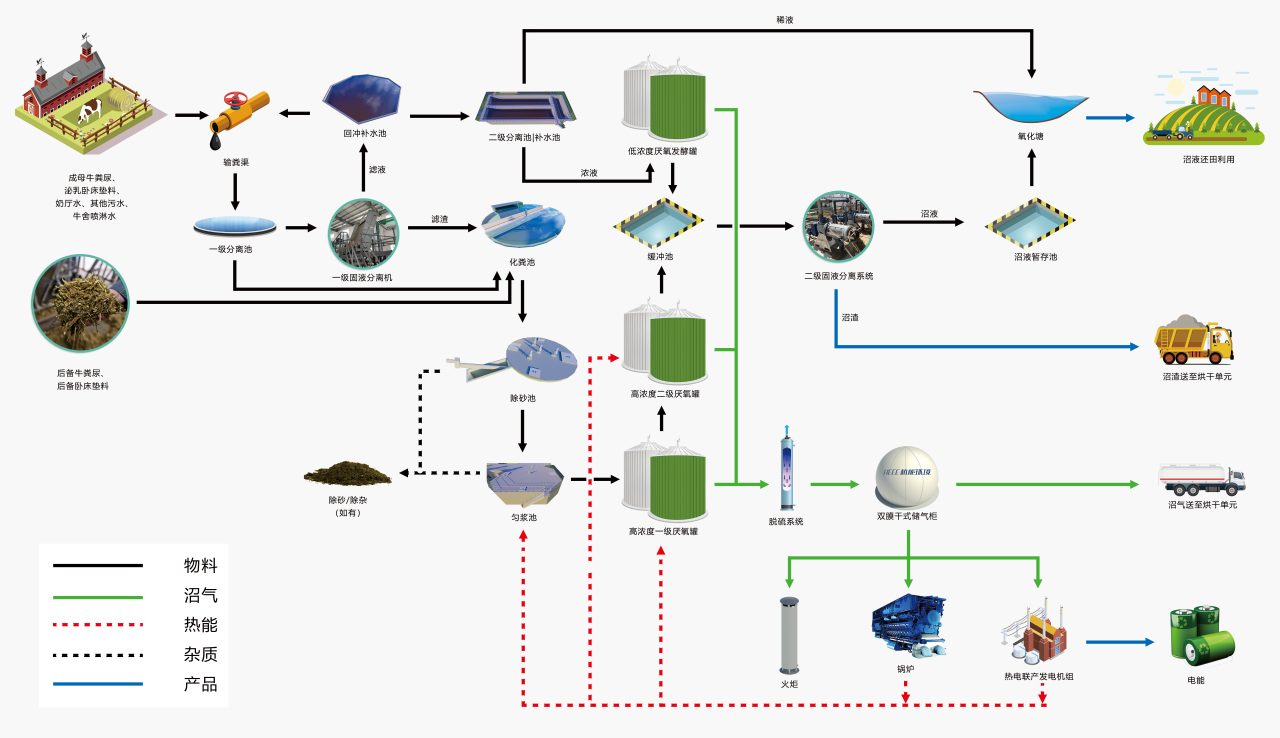 牧場(chǎng)沼氣項(xiàng)目通常以沼氣工程為樞紐,采用畜禽糞污水解除砂、厭氧發(fā)酵、高效節(jié)能攪拌機(jī)設(shè)備、沼氣能源化高效利用、沼渣墊料再生循環(huán)利用等多項(xiàng)核心工藝技術(shù)和關(guān)鍵設(shè)備,有效解決牧場(chǎng)糞污治理環(huán)保問(wèn)題的同時(shí)實(shí)現(xiàn)甲烷減排,助力牧場(chǎng)積極踐行“雙碳”行動(dòng),實(shí)現(xiàn)牛糞污減污降碳。杭能環(huán)境幾十年如一日在有機(jī)廢棄物資源化領(lǐng)域不斷深耕,不斷創(chuàng)新,為推動(dòng)牧業(yè)養(yǎng)殖高質(zhì)量、節(jié)能綠色發(fā)展貢獻(xiàn)力量。